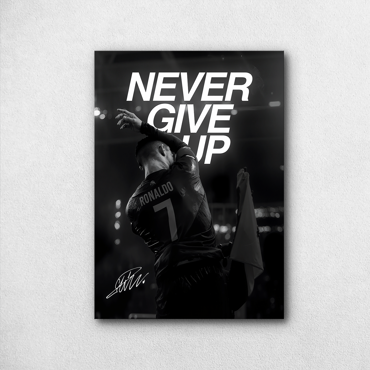 Featuring Ronaldo’s iconic back pose with the number 7 standing bold, the artwork delivers a surge of energy and inspiration. The dramatic black-and-white palette paired with the bold “NEVER GIVE UP” message creates a visual reminder to stay hungry, stay focused, and keep fighting — no matter how tough the journey becomes.