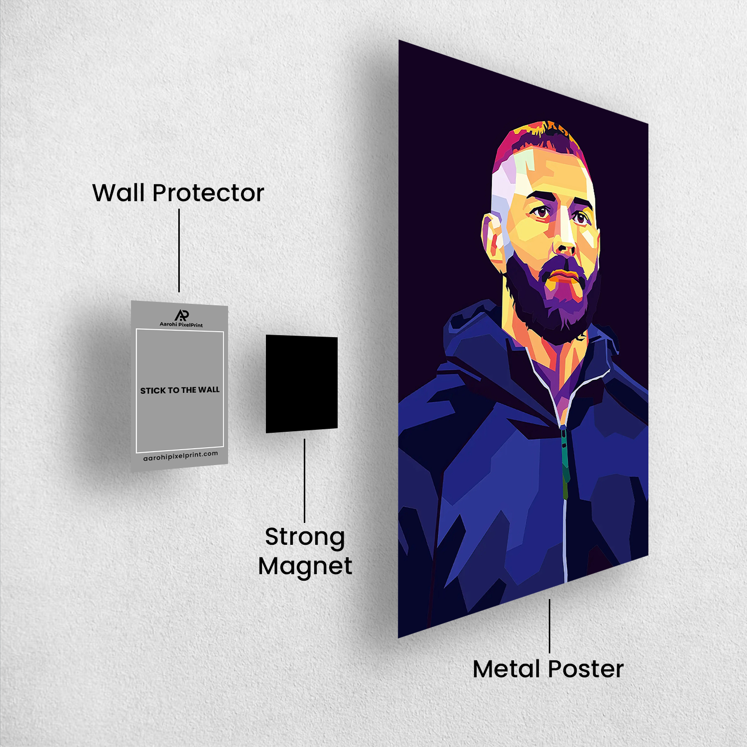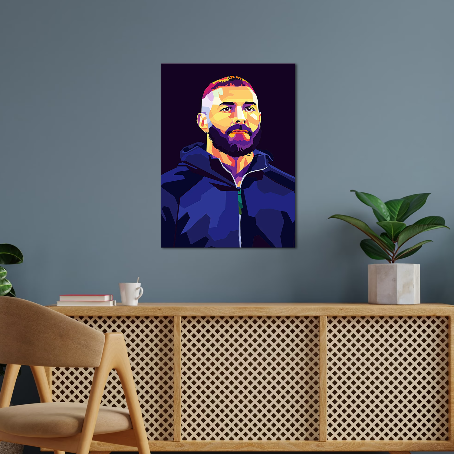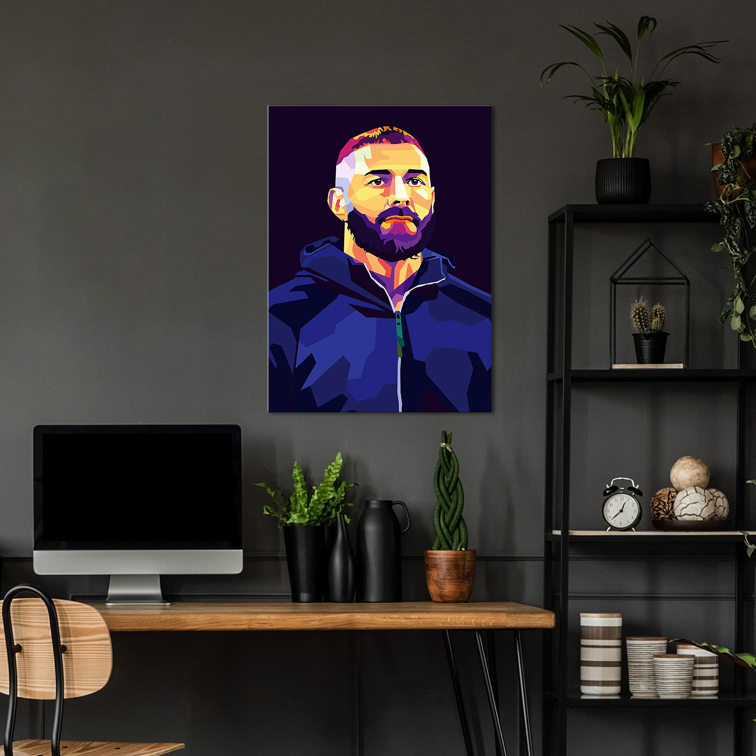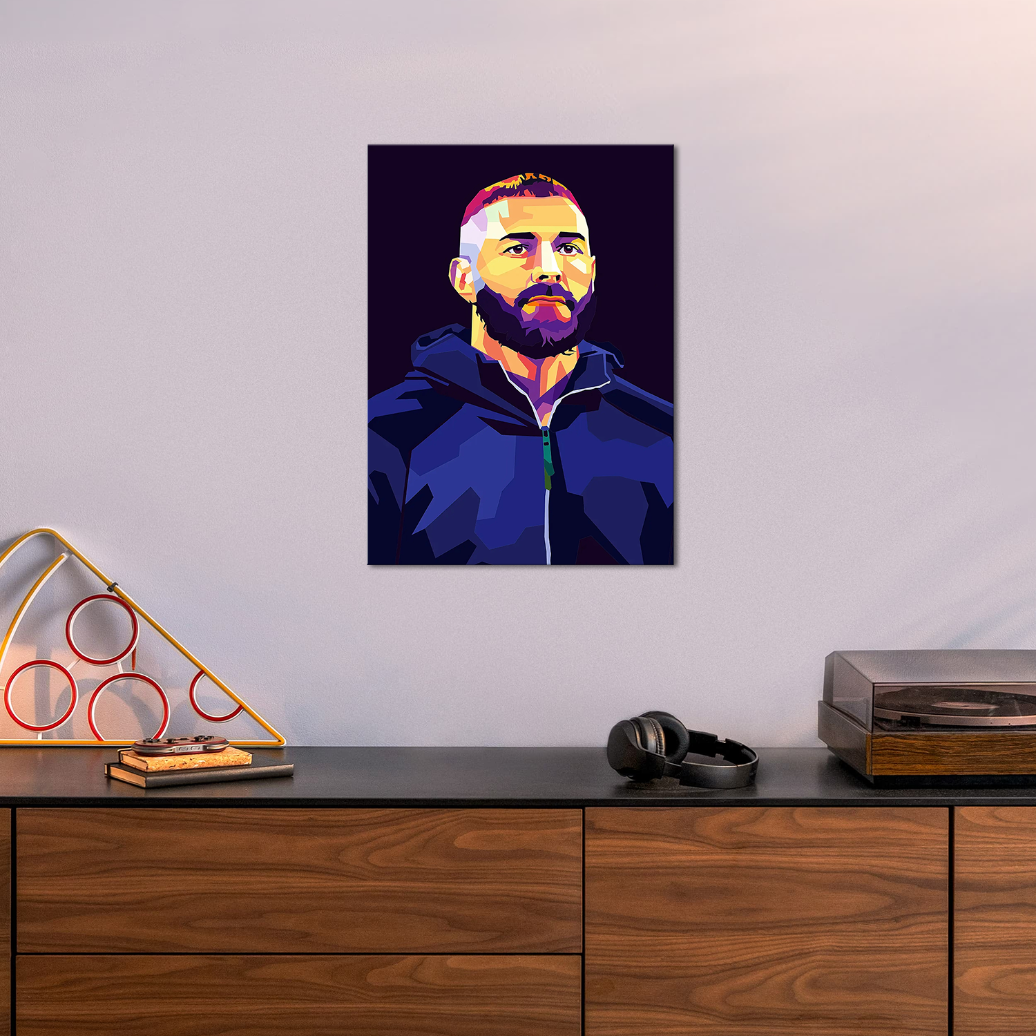 This WPAP-style Benzema poster strips it all back — just the man, the mindset, and the mission. With razor-sharp color blocks and abstract vibes, this artwork hits with street-style power and gallery-worthy flair.