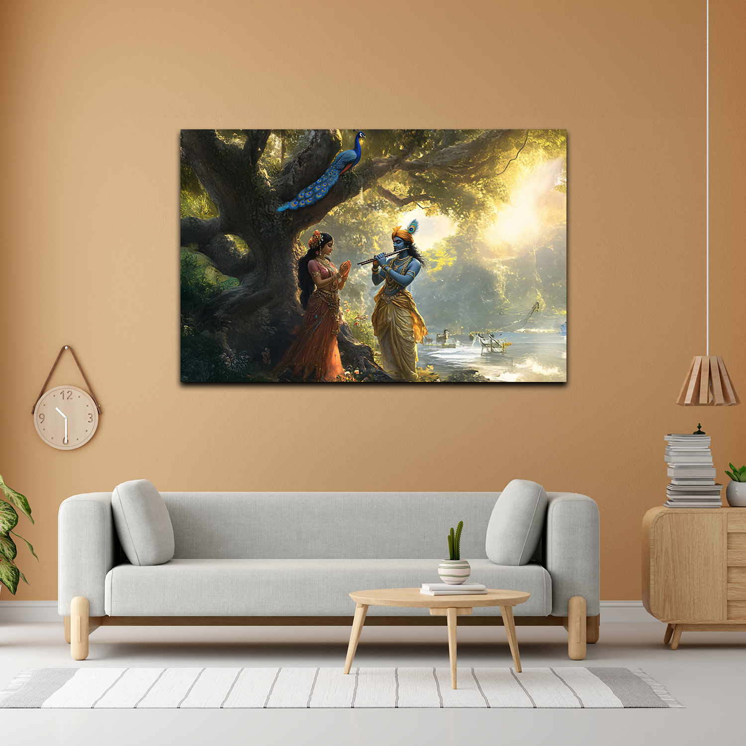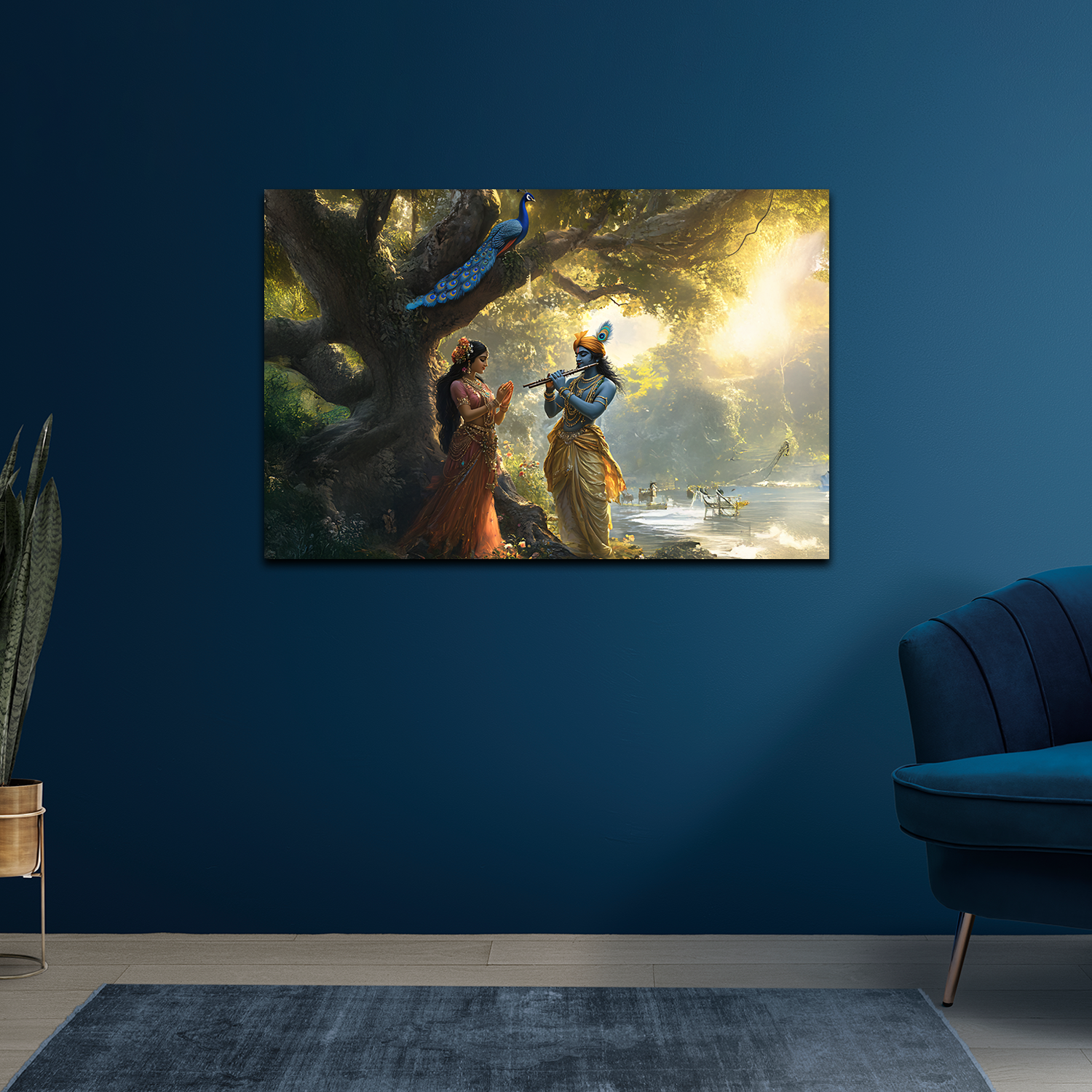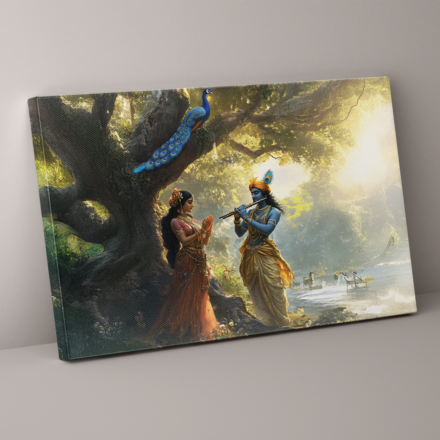 Depicting Lord Krishna playing his flute under an ancient tree as Radha listens in pure devotion, this painting captures the soul of eternal love and peace.