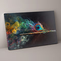 The motion of color spreading from the feather evokes the moment sound turns into matter — music becoming the universe.