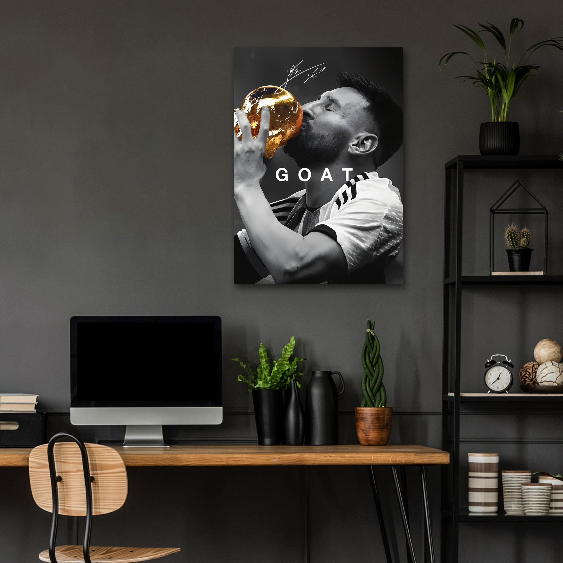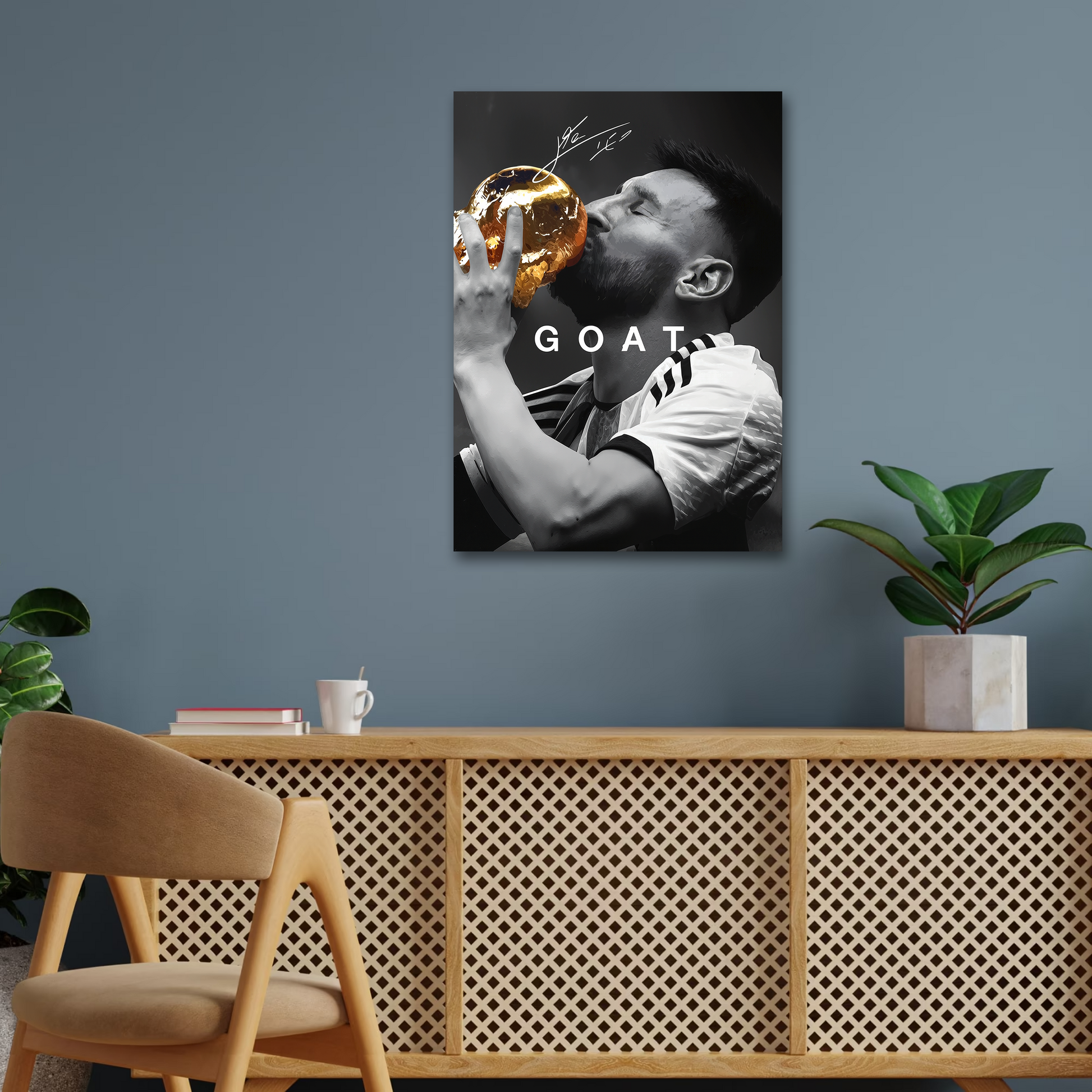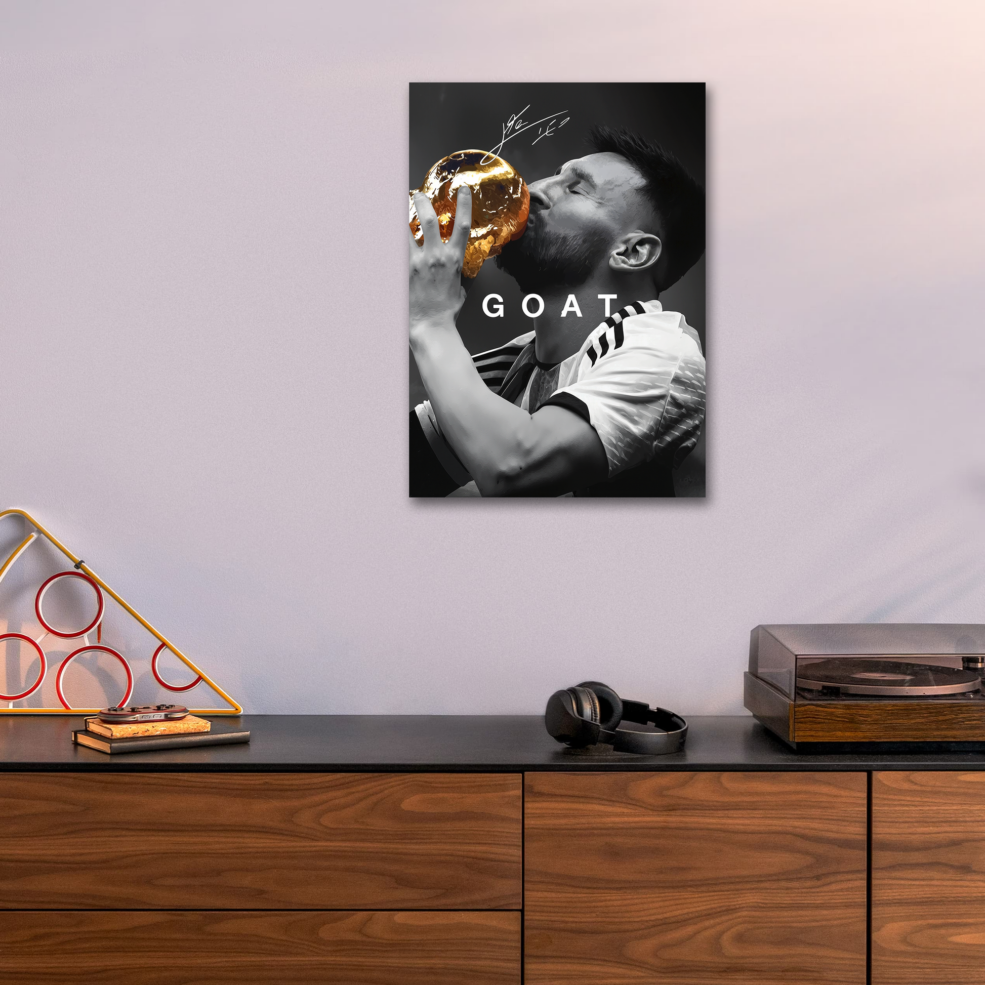 The artwork blends a monochrome portrait of Messi with the glowing gold of the World Cup trophy, creating a dramatic contrast that instantly draws attention. The bold “GOAT” lettering beneath him reinforces the legacy he carved over two decades of brilliance.