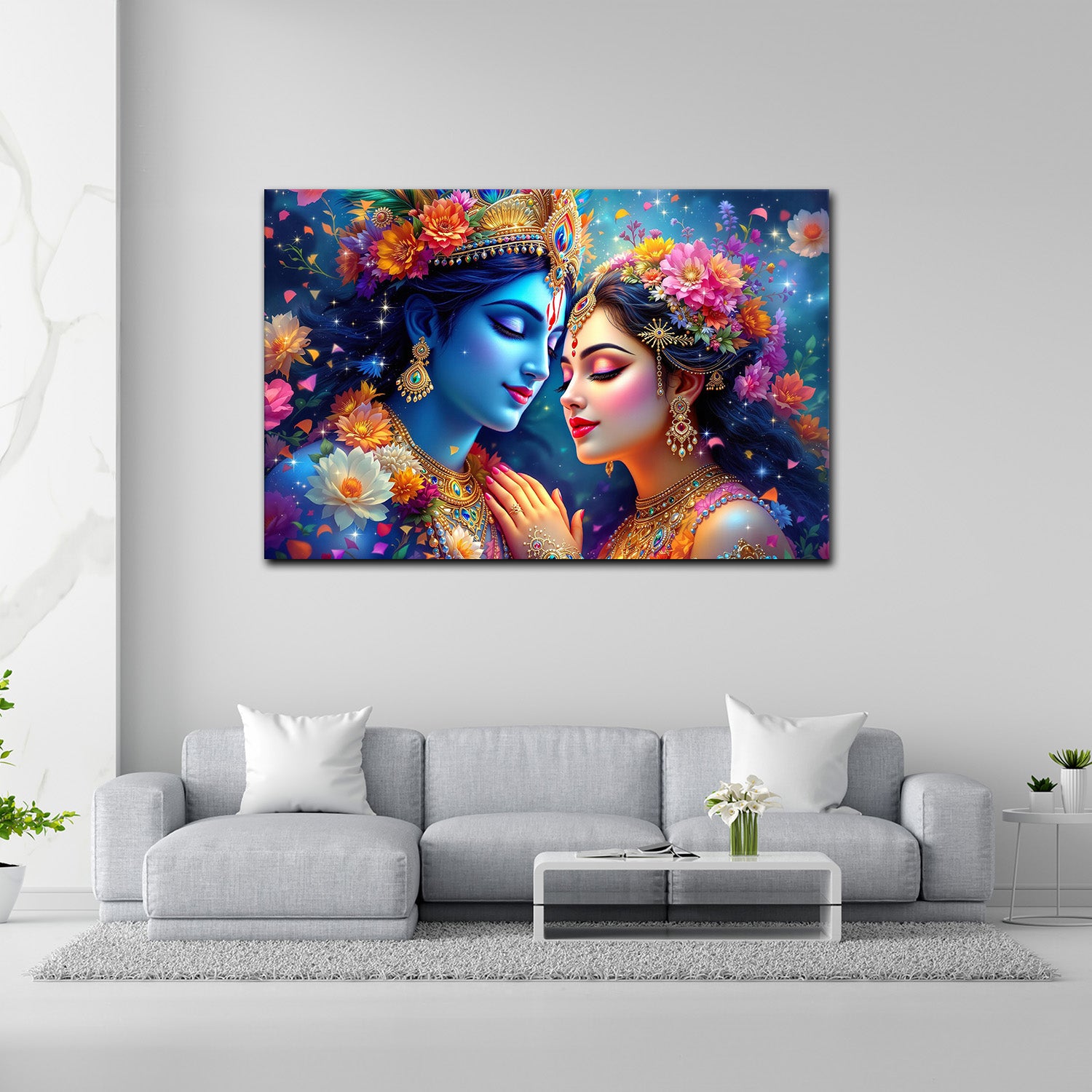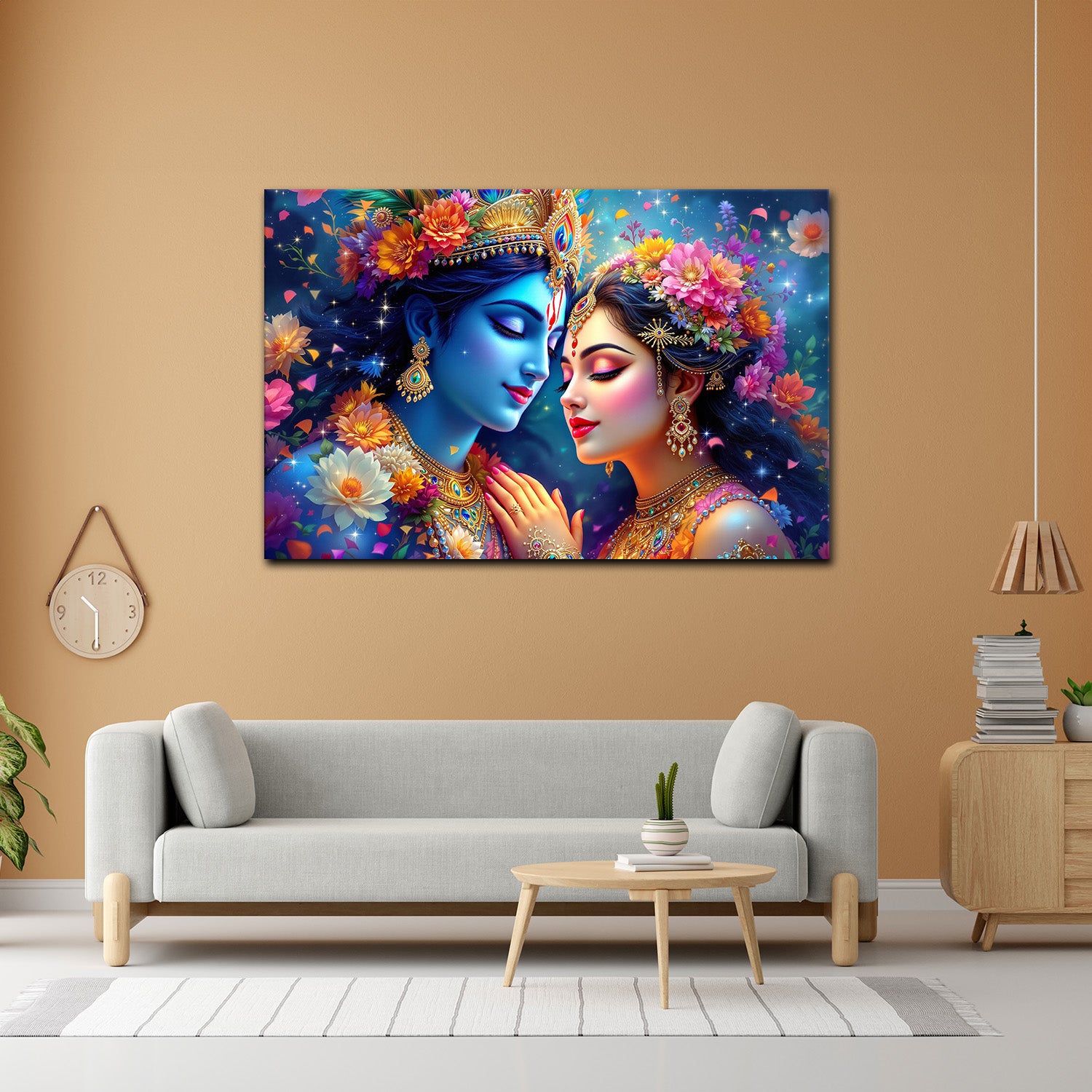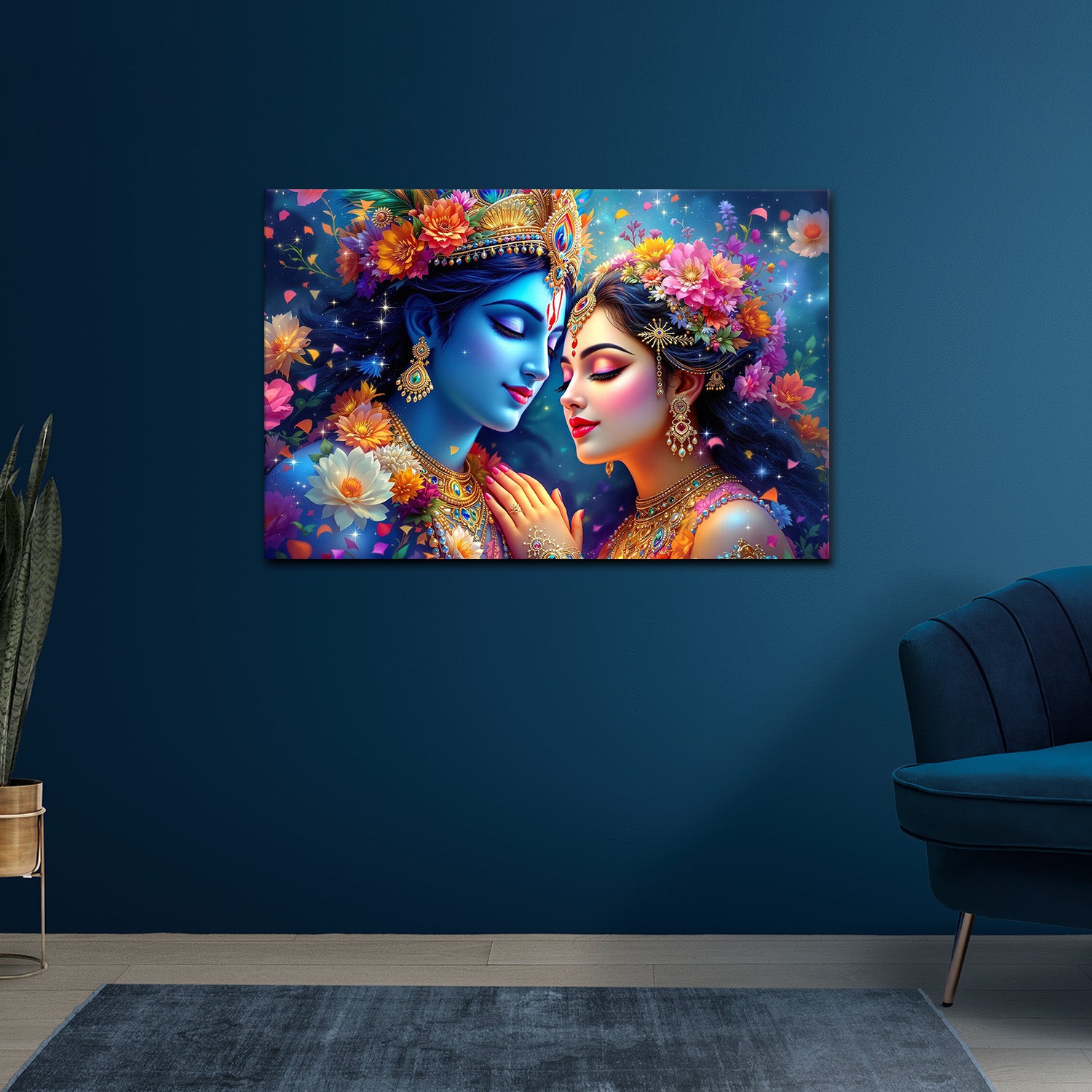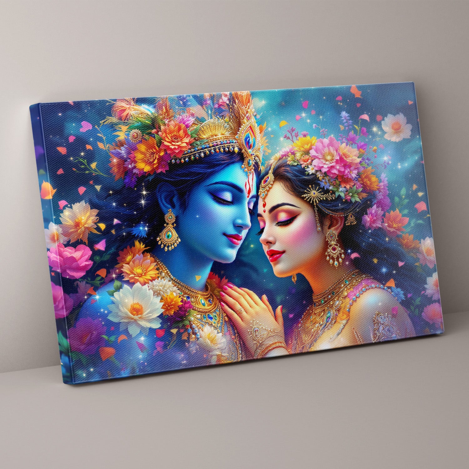 Radha Krishna Canvas Painting with Divine Colors, Floral Aura & Spiritual Glow