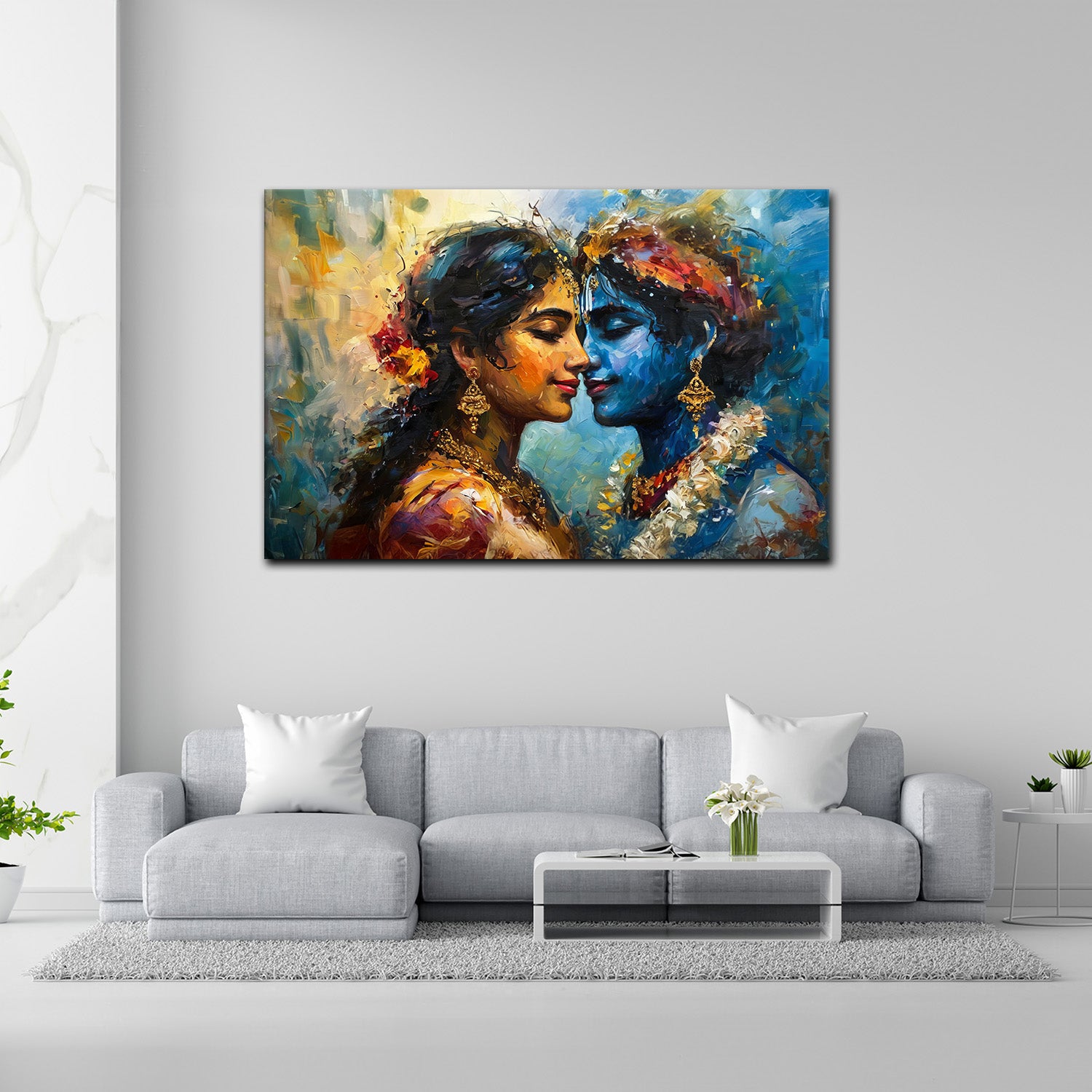 This artwork celebrates Radha and Krishna through the lens of modern impressionism — where color, light, and texture come together to express divine emotion.